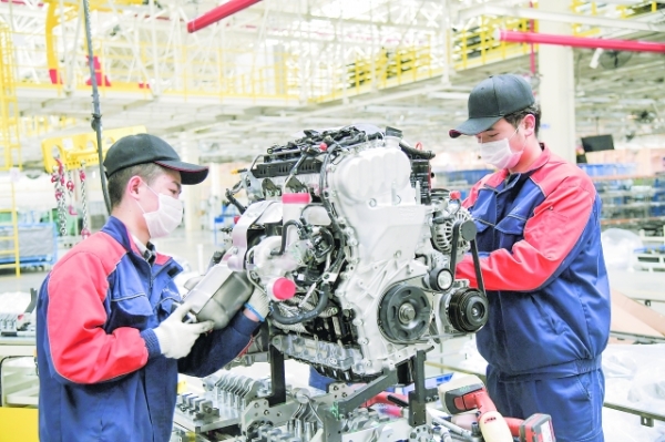 圖為貴州吉利汽車工作人員安裝汽車發(fā)動機。 王明元 攝