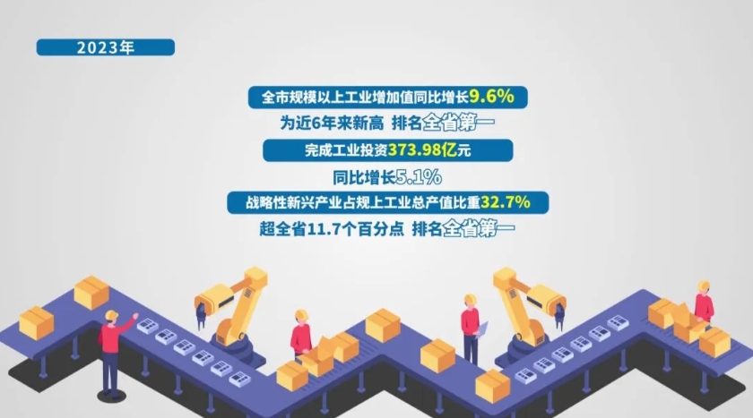 一組數據振奮人心:2023年,全市規模以上工業增加值同比增長9.6%,為近6年來新高,排名全省第一;完成工業投資373.98億元、同比增長5.1%,戰略性新興產業占規上工業總產值比重32.7%,超全省11.7個百分點,排名全省第一。