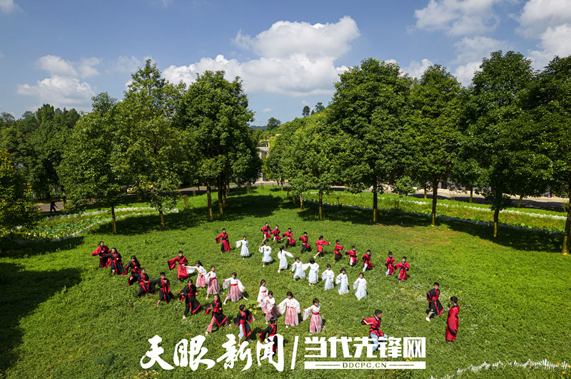 8月11日,黔西市洪水鎮新橋村公益夏令營活動,孩子們在志愿者的組織指導下練習武術(航拍)。(貴州圖片庫供圖)