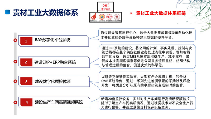根據(jù)公司發(fā)展戰(zhàn)略,為推進科技進步,增強企業(yè)核心競爭力,加快公司發(fā)展,經(jīng)公司研究決定,于2021年01月01日成立貴材大數(shù)據(jù)中心。大數(shù)據(jù)中心建筑面積400平方,累積投資600萬,具備了生產(chǎn)排產(chǎn)調(diào)度,BAS數(shù)據(jù)智能分析模型,透明化車間監(jiān)控平臺,能源智能分析平臺,和數(shù)字化質檢系統(tǒng)。貴材數(shù)據(jù)中心是由海康威視,海信商顯,微軟中國,東芝中國,TCL,貴材大數(shù)據(jù)部和貴州大學等多個優(yōu)質軟硬件集成商和科研機構的所共同打造的一個高度現(xiàn)代化的數(shù)字化成果,基于海量數(shù)據(jù)采集、匯聚、分析的服務體系,加快提升企業(yè)生產(chǎn)制造全過程、全產(chǎn)業(yè)鏈、產(chǎn)品全生命周期的數(shù)字化、網(wǎng)絡化、智能化水平。一是提升企業(yè)生產(chǎn)管理智能化水平。基于數(shù)據(jù)模型,促進設備資產(chǎn)在線管理、基于平臺的生產(chǎn)運營優(yōu)化、產(chǎn)業(yè)鏈生態(tài)資源服務等創(chuàng)新模式,借助平臺上匯聚的各個管控系統(tǒng),企業(yè)工程師、銷售人員以及決策者能夠以更低的成本、更高的效率、更具拓展性地在研發(fā)、生產(chǎn)、銷售、服務、管理等各環(huán)節(jié)優(yōu)化升級。二是實現(xiàn)關鍵生產(chǎn)設備的智能化監(jiān)控,提高企業(yè)生產(chǎn)運營效率。通利用平臺推動數(shù)字化設備管控服務,實現(xiàn)遠程數(shù)據(jù)監(jiān)控、設備跟蹤與故障預測。三是實現(xiàn)生產(chǎn)能力的個性定制與快速轉化。依托集成平臺發(fā)揮企業(yè)技術積累與個性化定制優(yōu)勢,通過引入產(chǎn)線、改造工藝等方式快速實現(xiàn)產(chǎn)品量化生產(chǎn)。