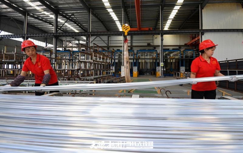 ??切割、校直、打包......8月初,記者走進(jìn)位于貴陽國家經(jīng)濟(jì)技術(shù)開發(fā)區(qū)花冠路的貴州貴材擠壓車間,現(xiàn)場一片繁忙景象。一根根長約6米的鋁棒被叉車叉上擠壓機(jī),通過鋁棒加熱爐軟化,由模具擠壓后變成半成品,再經(jīng)過氧化或噴涂就可以銷往市場。