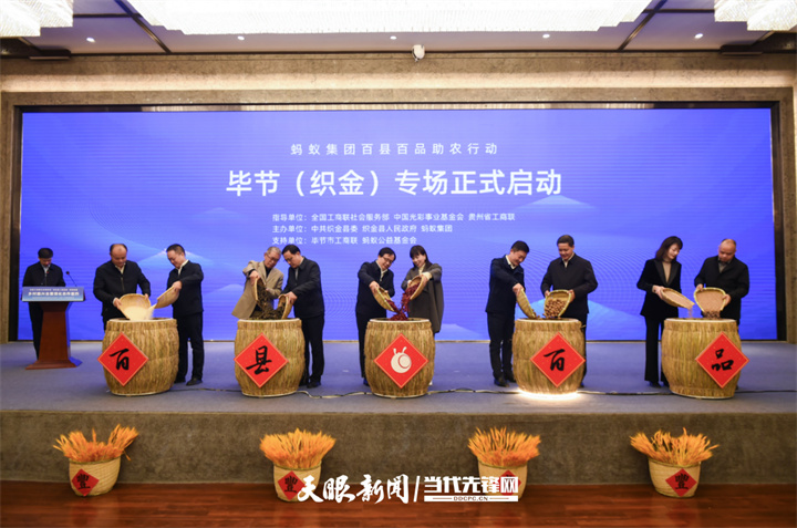 2023年11月22日,全國工商聯社會服務部、螞蟻集團與織金縣簽署鄉村振興全面深化合作三方協議,螞蟻集團“百縣百品助農行動”畢節(織金)專場正式啟動,織金竹蓀、獼猴桃等100多種畢節特色農產品通過支付寶助農頻道等線上渠道鏈接全國網友,民營企業助力鄉村振興再添新績。